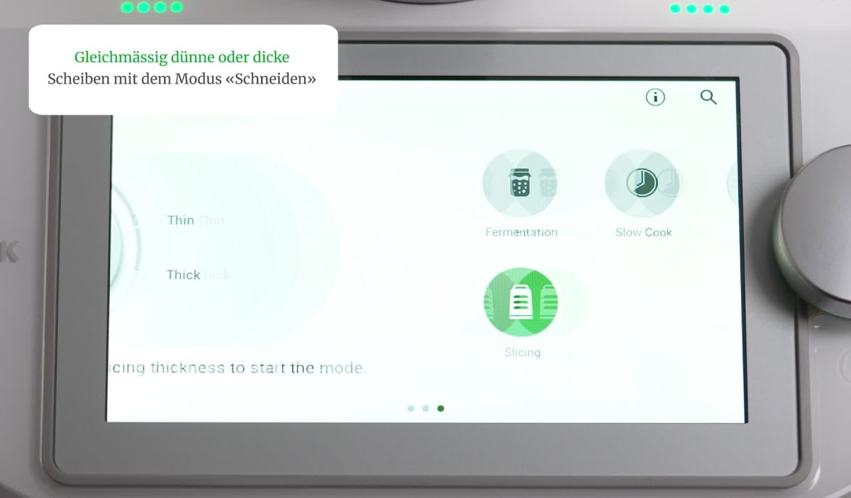 Mit der Thermomix® 4-in-1 Reibe und dem passenden Modus "Schneiden" sind perfekte Scheiben ein Kinderspiel! Im Modus kannst du bequem zwischen den Einstellungen dick und dünn wählen. Alles, was du dann noch tun musst, ist das Obst oder Gemüse durch die Öffnung des Reibendeckels zu geben.
