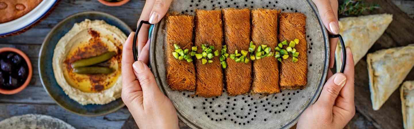 Les pistaches sont une denrée indispensable durant le Ramadan, très prisées pour garnir les pâtisseries traditionnelles comme les baklavas, kunafas et qatayefs, symbolisant la richesse et la fête. Elles sont appréciées pour leur apport en énergie, leurs nutriments et leurs antioxydants, parfaits pour la rupture du jeûne.
