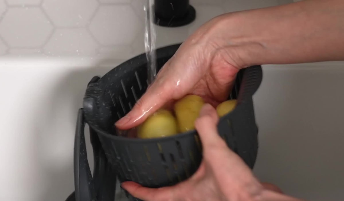 Ora puoi lasciarlo fare a Thermomix®. È sufficiente inserire l’accessorio Thermomix® Copri Lame Più fissandolo sul gruppo coltelli, aggiungere 600 g di acqua, un massimo di 800 g di ortaggi a radice crudi e selezionare la Modalità Pelare. Ideale per le patate e un’ampia varietà di ortaggi a radice.