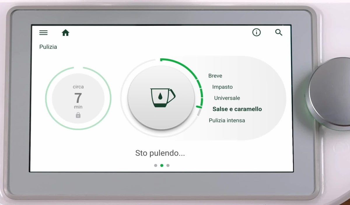 Con la Modalità Pulizia è sufficiente scegliere uno dei cinque programmi e Thermomix® sarà libero anche dai residui di cibo più ostinati. Questa Modalità pre-tratta il boccale e il gruppo coltelli prima del lavaggio finale a mano o in lavastoviglie.
