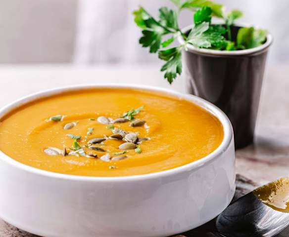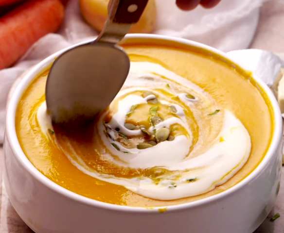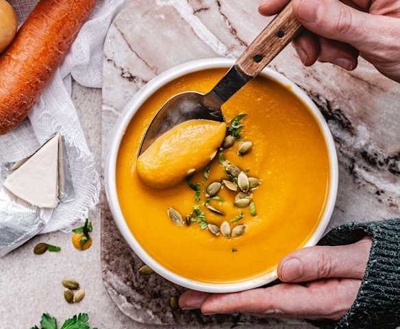 Velouté de carottes au gingembre, dés de feta et amandes grillées