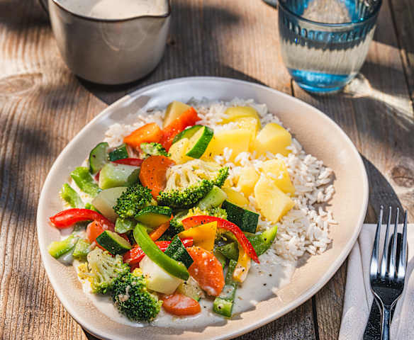 gemischtes Gemüse in Stücken (z. B. Möhren 1 cm, Zucchini 2-3 cm, Paprika 2-3 cm, Brokkoliröschen 2 cm, Kohlrabi 1-2 cm oder Blumenkohl 2 cm)500 g